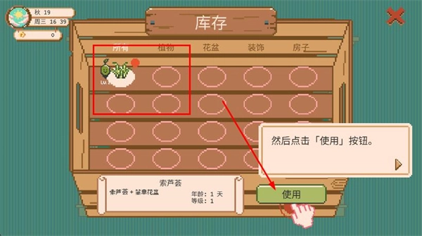 打开库存界面,选中已解锁的植物,点击使用,把它添加到培育队列中。