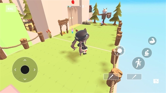 4、进入地图后,左侧轮盘用于操控角色移动,右侧轮盘负责控制表情,其余按钮则分别为攻击键、跳跃键和蹲下键。