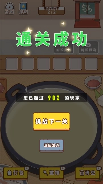 1、每次点击一种食材,下方的食材就会浮到汤面,挑选三个一样的菜品提供给顾客,以此满足顾客的需求!