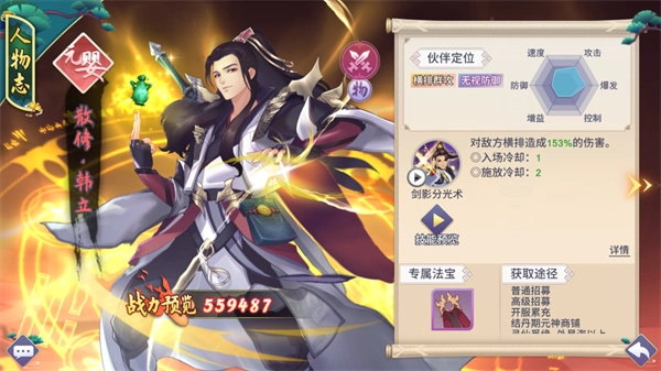 搭配详解:伙伴散修·韩立的技能能够对敌方横排造成伤害,若搭配红线遁光针来提升暴击属性,就能打出巨额输出。