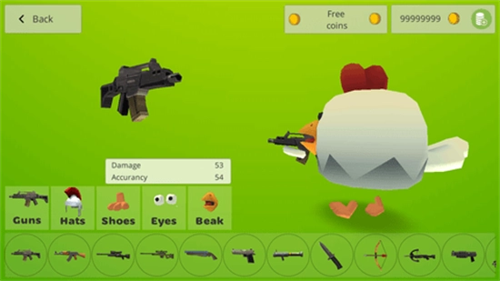 1、扮演萌萌哒的小鸡,轻松的击溃敌人,收集金币,强化自己的武器。
