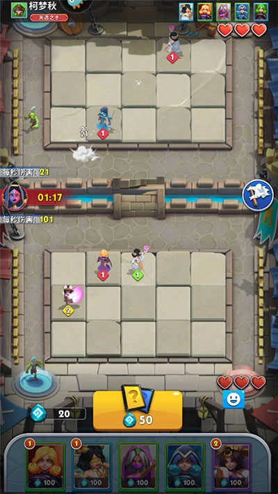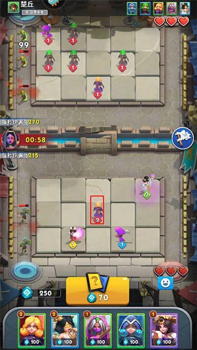 2、进入游戏后,双方会各自占据一片专属场地,且各自拥有三点初始生命值。每当敌人成功突破我方防线一次,我方生命值就会减少一点,一旦生命值归零,游戏即宣告结束。玩家需要消耗宝石来部署英雄,借助英雄的力量攻击来袭的魔物。