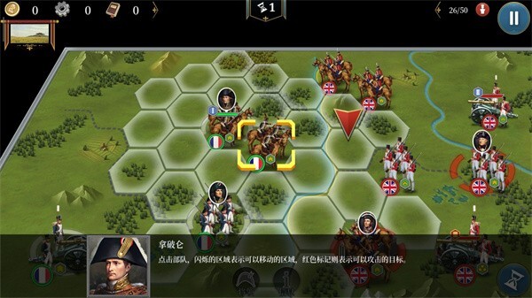 4、点击部队闪烁的区域,该区域即为可移动范围,而红色标记所指之处,则是可以攻击的目标。