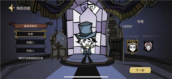 游戏开启后第一步是创建角色,除了能选择性别外,还可以挑选身世背景。当前提供「学者」「驱魔人」「吹笛人」三种选项,身世仅对角色外观产生影响,因此选择自己喜欢的样式即可。