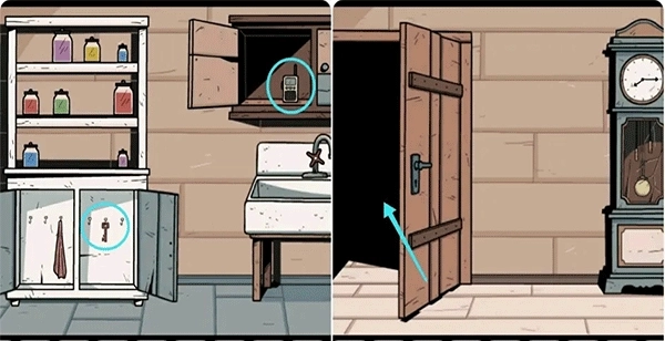 2、推开那扇蓝色的门进入盥洗室,依据照片上的提示来摆放架子上的罐子,完成这一步后取走下方的钥匙,随后打开水池上方的柜子获取对讲机,之后离开盥洗室,用钥匙打钟左侧的门。