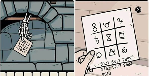 5、前往壁炉处,掀开画框上的白布以触发剧情;随后用对讲机对准壁炉,会收到一张纸条。仔细观察纸条上的符号,再结合收音机的频道数字,就能得到对应的四个符号密码。