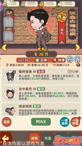 龙九启动主动技能时,会飞身进入战场,吸引附近敌人攻击自身,同时提升物理防御;当血量耗尽或技能持续时间结束,便返回老屋。她的被动技能能够同步强化物理防御、法术防御与生命值,让自身坦度更高,此外,攻击龙九的目标还会受到反弹伤害并被降低攻击速度。龙九的功能相当全面:主动技能自带嘲讽效果,强悍的被动技能不仅让她更能承受伤害,还能使她造成一定输出,可有效拖延敌人;而且开启主动技能后,她会跃至最前方敌人面前进行嘲讽,也能切实保护老屋,建议大侠将其作为主力抗伤伙伴来培养。