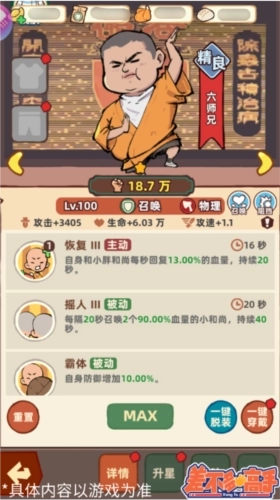 六师兄每隔一阵子,就会召唤两个小和尚到场中,让他们去攻击敌人并吸引火力;他的被动技能能提升自身防御,而主动技能开启后,每秒都能为小和尚恢复气血。作为前期相对容易获取的召唤型伙伴,要是前期输出不够、敌人很容易冲到老屋时,不妨考虑让六师兄上阵试试看~