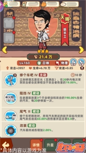 扳手工能够在老屋前放置3辆静止不动的汽车,并且每隔一段时间就会对其进行一次修复;激活扳手工的主动技能后,可立即将汽车修复至满血状态,同时汽车在每次受到伤害时都会进行伤害反弹,技能开启的瞬间还能对汽车周边的目标造成伤害并使其陷入眩晕;扳手工召唤的汽车固定位于老屋前方,所有前来进攻的敌人都会优先攻击这些汽车,从而为老屋抵挡大量伤害,起到保护老屋的作用。
