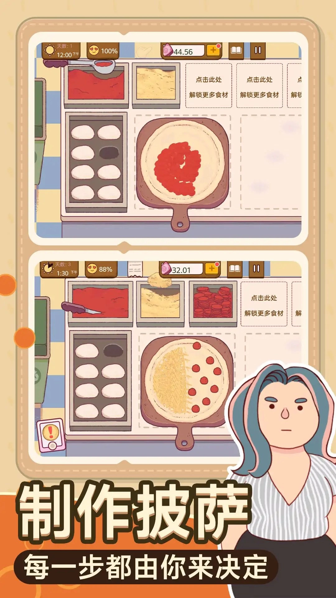 一款充满趣味与巧思的烹饪游戏,在这里你可以化身厨师,经营专属餐厅并为顾客呈上美味佳肴。能体验从食材采购、菜品研发到实际烹饪的完整流程,学习各类菜式的制作方法。更有丰富多样的厨房工具与装饰品可供选择,通过食材的创意搭配能制作出新奇的披萨口味,是一款好玩又解压的美食模拟游戏,感兴趣的小伙伴快来本站体验吧。