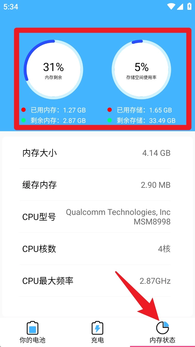 4. 于「内存状态」页面,能够查看内存与存储空间的使用率,同时展示 CPU 型号以及核心参数。