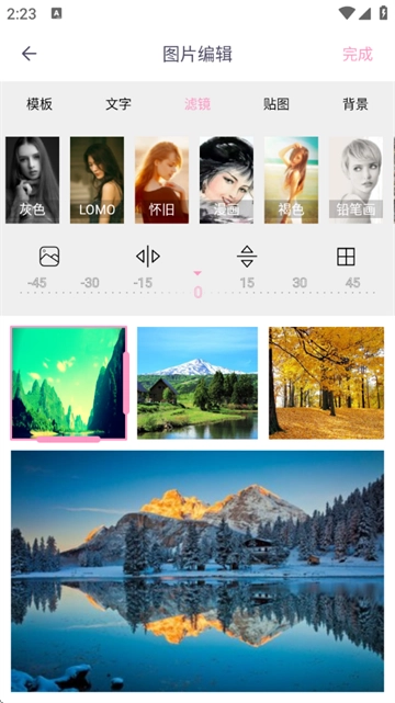 3、还能添加文字、背景,选中单张图片添加滤镜