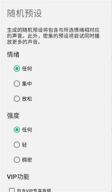 2、 除了手动设置外,APP还支持随机预设功能,系统会根据用户的喜好自动推荐匹配的音乐场景,省时又有惊喜感。