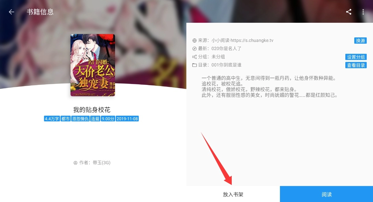 3、进入小说阅读界面后,点击屏幕下方"放入书架"按钮,这本书就会自动保存到你的书架里。