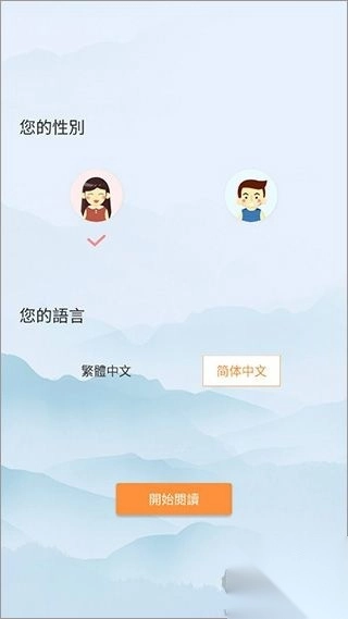 1、打开小说迷app,选择性别、语言,点击开始阅读;