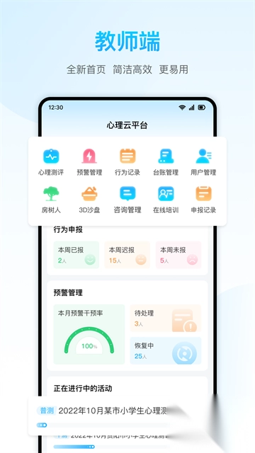 为学校提供用户管理、心理测评、分析及危机预警、心理咨询,档案管理等一站式心灵管理解决方案;