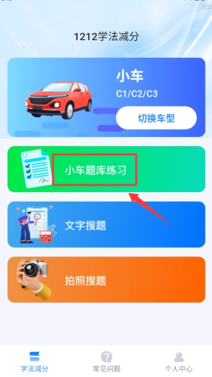 1、进入1212学法减分APP后,在首页选择"题库练习"功能,进入驾考题目分类界面。