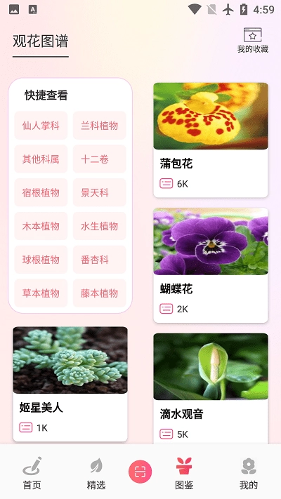 3、切换到图鉴页面,各类植物图片映入眼帘,方便你直观认识不同植物的形态特征。