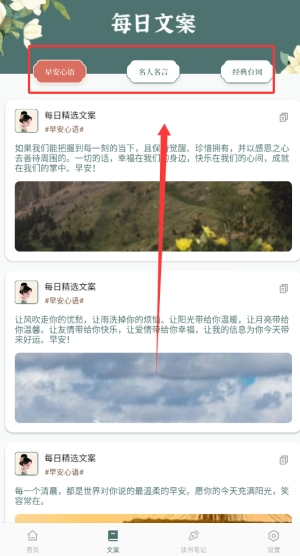 3、丰富的优质文案资源,早安问候语帮你开启诗意一天,名人名言启迪思考,经典台词提升表达能力。