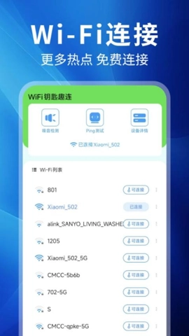 3、WiFi钥匙趣连可智能识别周边安全热点,能迅速扫描出可用的WIFI网络,还具备一键连接功能。