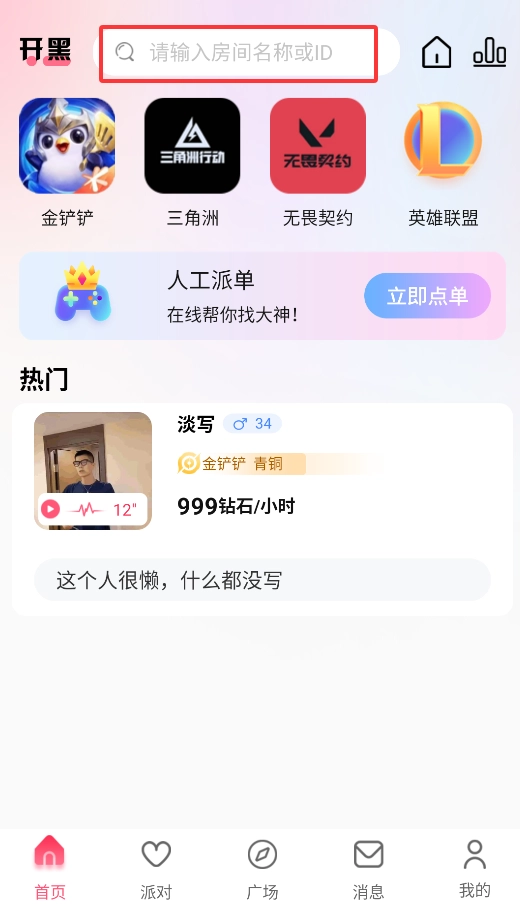 2、在搜索栏输入房间号或名称,可快速加入好友创建的语音聊天房间。