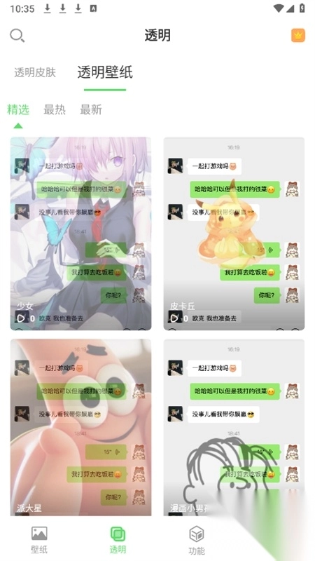 3、点击透明,可以查看各种透明壁纸和透明皮肤