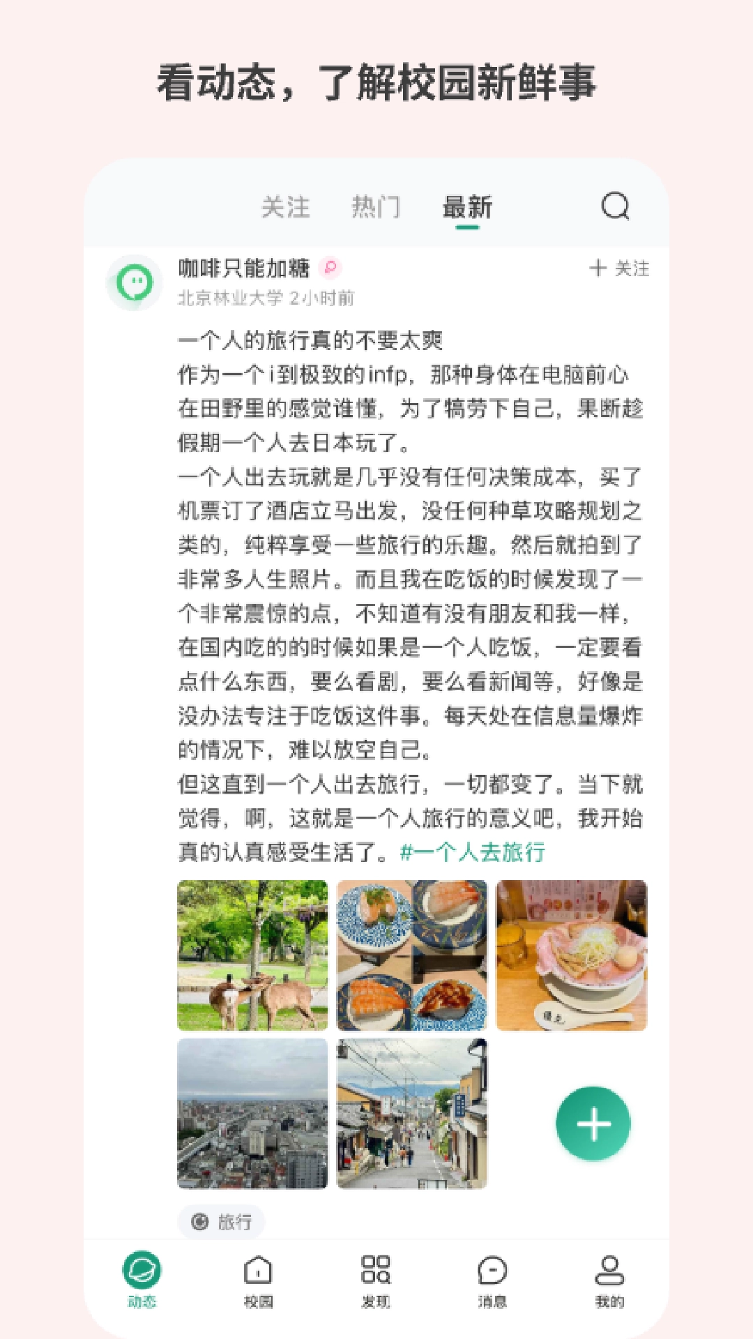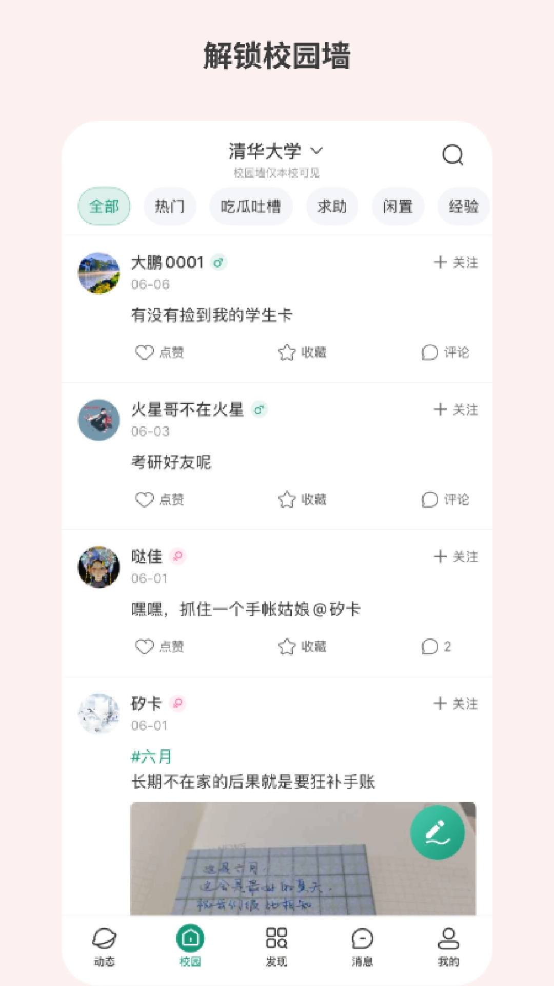 【校园热点速览】 “AI代课警报”、“反向打卡热潮”……快来这里,探索「校园新鲜事」。全国各大学校园广场动态实时刷新,总有一款能触动你。完成学校认证,即可解锁本校专属的「校园墙」,校内八卦吐槽、信息整合、问答互助、活动组队、校内服务、表白墙等精彩内容等你发掘。