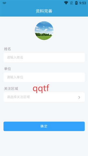 在完善资料界面输入你的姓名,单位和查看的天气区域,点击完成注册。