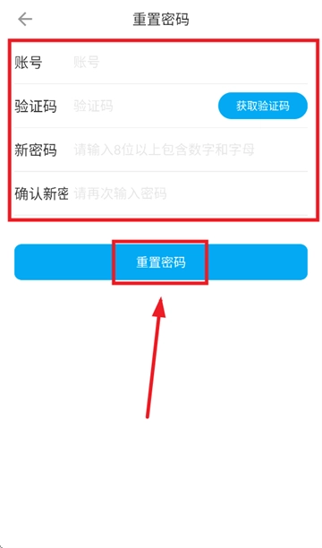 请依次输入账号、验证码以及新密码,随后点击“重置密码”按钮,操作即可完成。