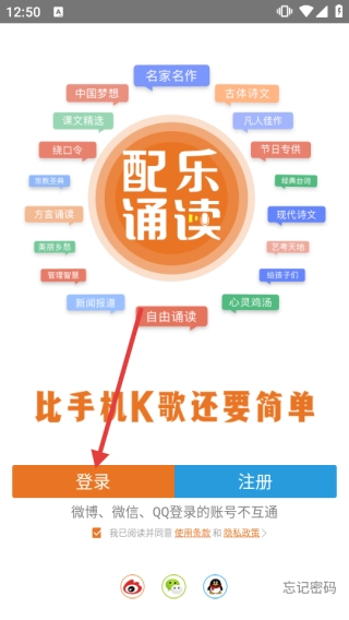 1、在配乐诵读首页,点击【登录】按钮,进入登录界面。