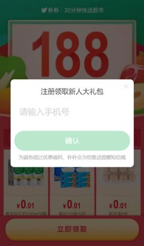 3、输入手机号,就能领取188元新人大礼包,马上在本站朴朴App使用优惠,开启便捷购物之旅!