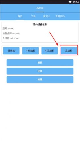 1、开启画质阁120帧,进入软件后呈现的界面如图所示,用户能够依据自己手机的配置情况来做出选择,例如高端机型。