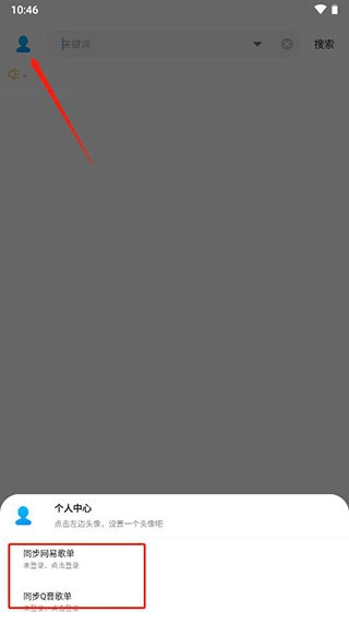 8、软件确实支持登录,点击左上角头像,会弹出个人中心,在此处选择同步歌单的类型即可。