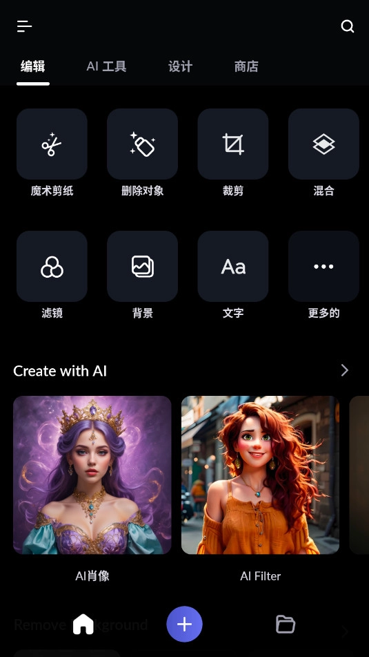 1. 启动LightX,点击底部的加号按键,开启新项目或者编辑图片。