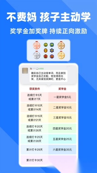 托词是一款面向低龄学生用户的免费英文学习安卓手机软件,助力学生学习英文单词。其资料库里包含从小学到高中的英文课程,可供学生自主选择学习。该软件设有学习签到奖励机制,只要学生连续签到达到特定天数,并且在课程学习中取得优良分数,就能获得丰厚的金额奖励。