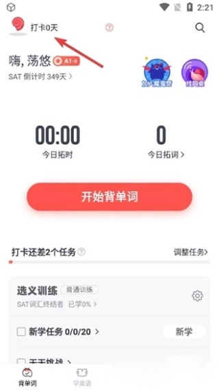 4. 如图,完成背单词以及挑战任务后,就能够去打卡了。