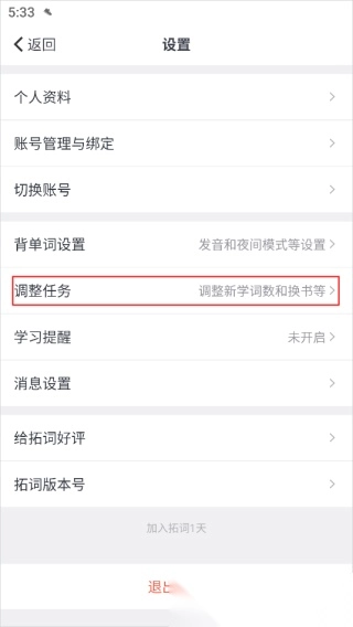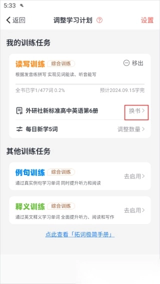 3. 进入调整学习计划页面,点击页面上方的“换书”按钮,就能更换单词书。
