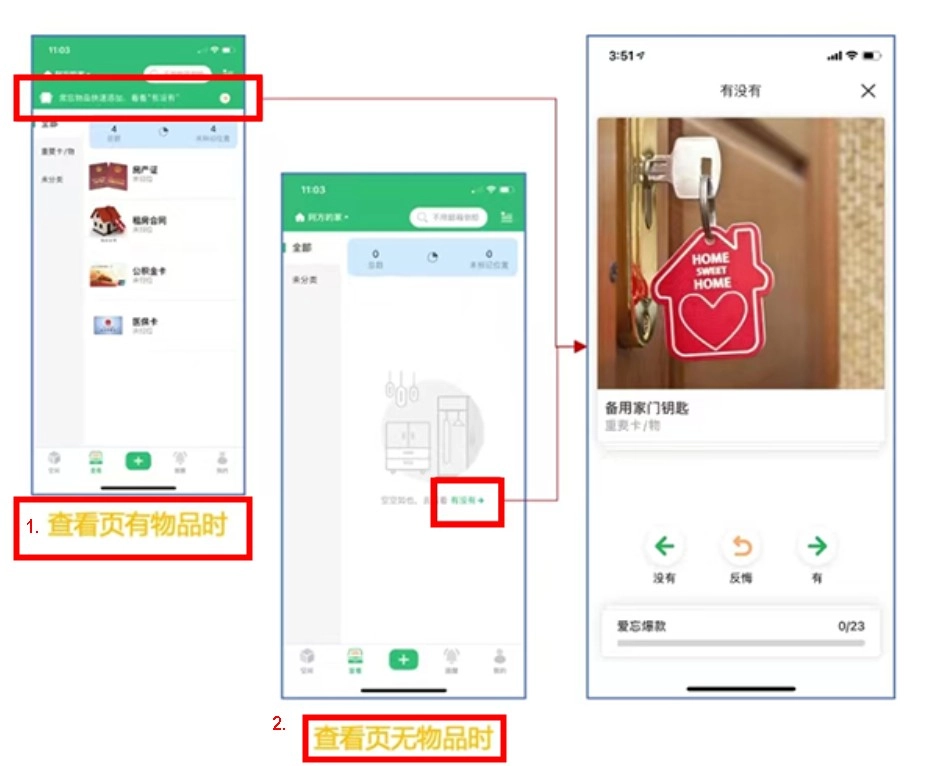 收哪儿App针对新用户设置了“有没有”模块,此模块里罗列着常见的易忘物品清单。用户能够直接查看该清单,并迅速挑选出想要添加的物品。