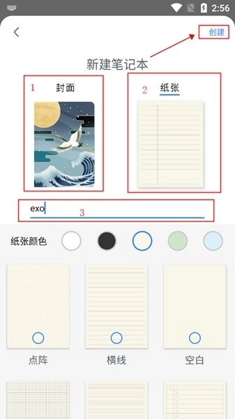 第三步:挑选笔记本封面,选定笔记本纸张类型与颜色,填妥笔记本名称后,点击“创建”就完成了。