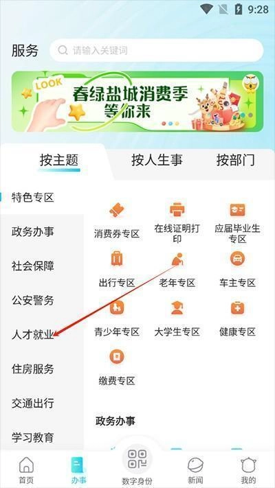 1、打开“我的盐城”软件,完成注册登录后,点击“办事”选项。