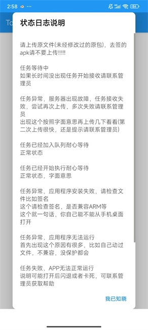 2. 阅读完状态日志说明后,点击“我已知晓”。