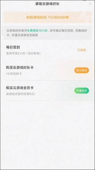 3、如需签到,需先退出当前界面,然后在相应界面中点击“获取云游戏时长”进行签到。