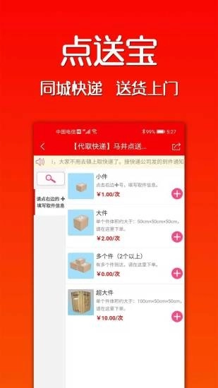 点送宝集成了:点外卖、发快递、网购、跑腿、打广告等众多功能,适用于一切可以在网上点单的产品和服务,其核心是:线上点单 、线下服务。 商家可以在《点送宝》上建立店铺,消费者可在公众号或小程序上浏览商家与商品的信息 ,用户根据提示,简单三步,15秒内,即可完成网购。店家可以通过电脑后台、手机或无线打印机多种 方式即时查看订单,并提供相应的产品或服务。 《点送宝》适用于:点外卖,发快递,购买优质原产地 特产,网购百货、服饰、美妆、蛋糕、鲜花等。。。还有快递送到家(乡镇用户)家政、开锁、搬家等 本地服务