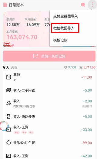 2. 打开一木记账,点击页面右上方,选择【微信截图导入】。