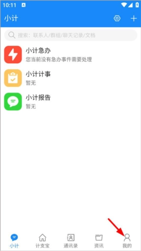 1. 用户登录计支宝后,进入小计页面。在此页面,用户能够查看小计急办、计事以及报告。接着,用户点击“我的” 。