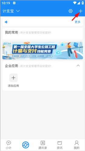 1. 用户登录计支宝后,点击打开计支宝页面。在此页面,用户能够查看“我的常用”以及“企业应用”,接着点击页面右上角的“+”。