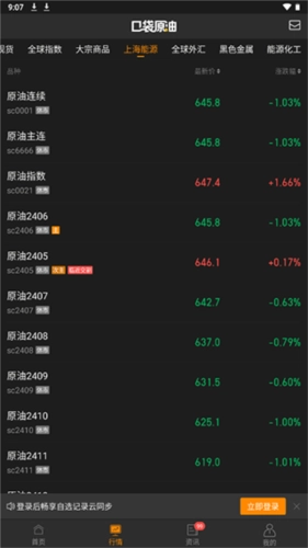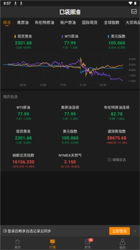 1、用户进入应用,在【行情】页面就能查看原油行情。在综合面板里,可看到原油、美元、黄金这三者的行情以及它们之间的涨跌关系。