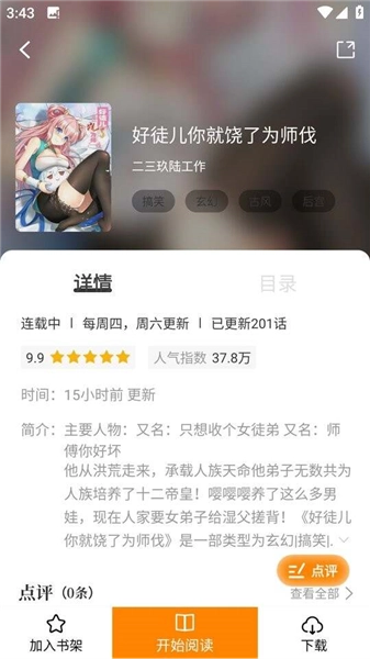 答:在漫画阅读界面,轻点屏幕中央,呼出菜单栏,点击相应按钮,就能对当前章节或整部漫画进行操作。