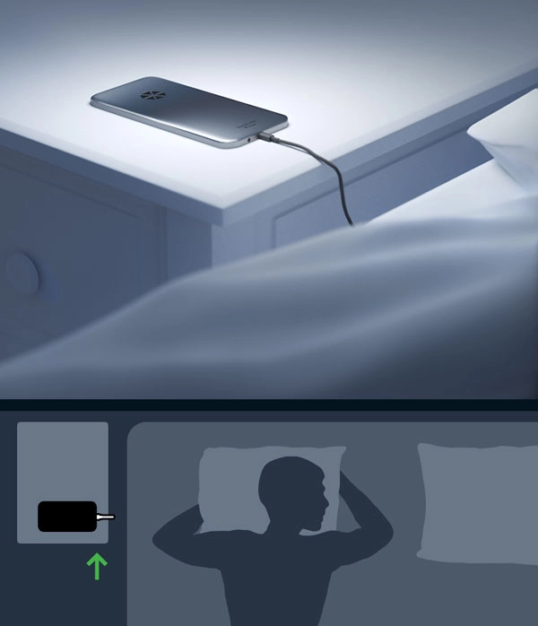 依据床与床垫的类型不同,您或许会察觉到某些放置方式效果更佳。请勿把手机放置在枕头或者厚床垫下方,原因是手机充电时可能会发热。要是您不适应将手机放置在靠近头部的位置,可将其设置为“飞行模式”。此外,这样做还能保证您在睡觉时不被他人打扰。