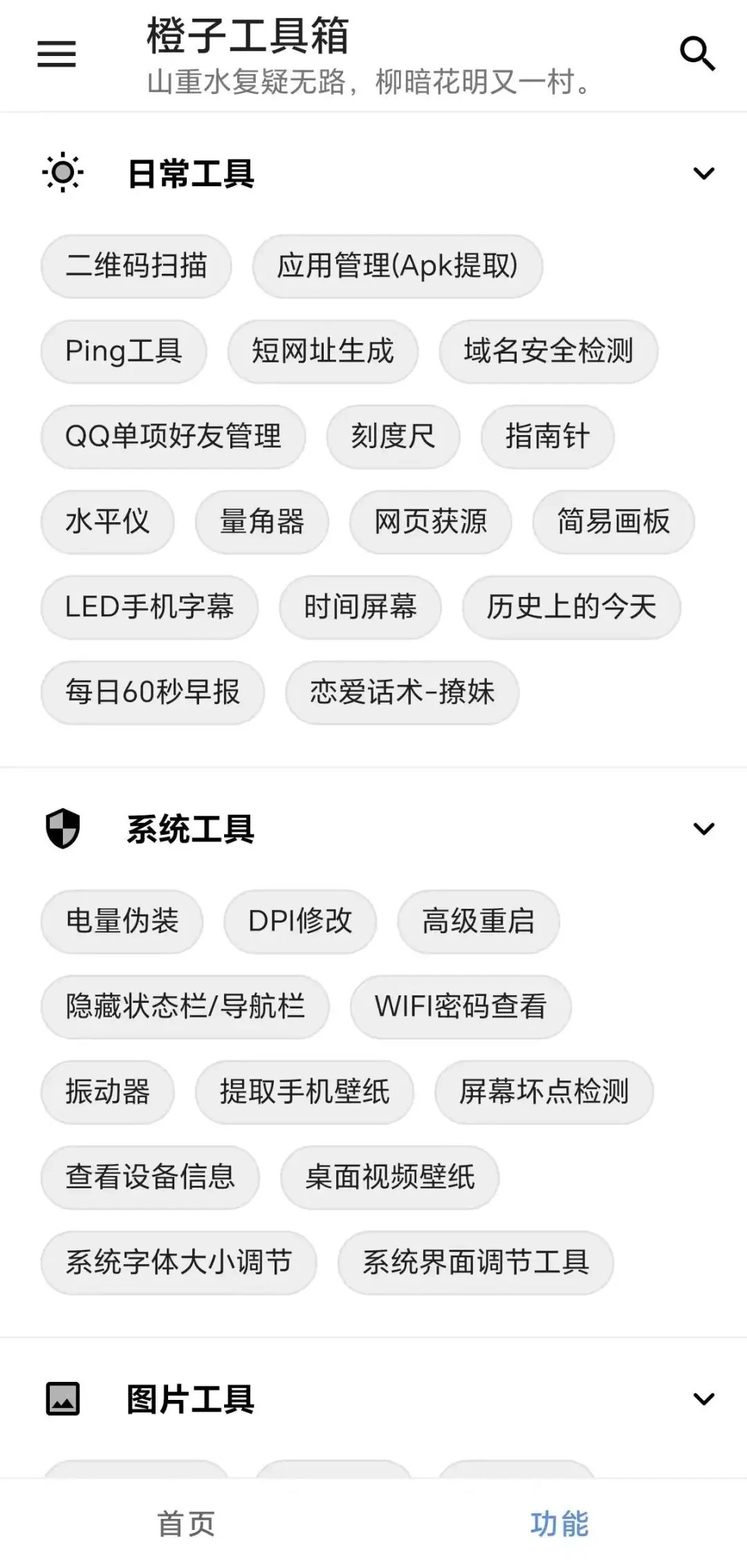 橙子工具箱,一款融合多种功能的安卓综合工具箱软件。凭借简约设计、强大功能以及高效的使用感受,它已然成为用户日常生活里的得力助手。不管是文字处理、图片编辑,亦或是计算工作、文件管理,橙子工具箱均能给予全方位的支持。倘若您想在忙碌生活中寻觅一款高效又便捷的工具软件,橙子工具箱无疑是值得一试的选择。